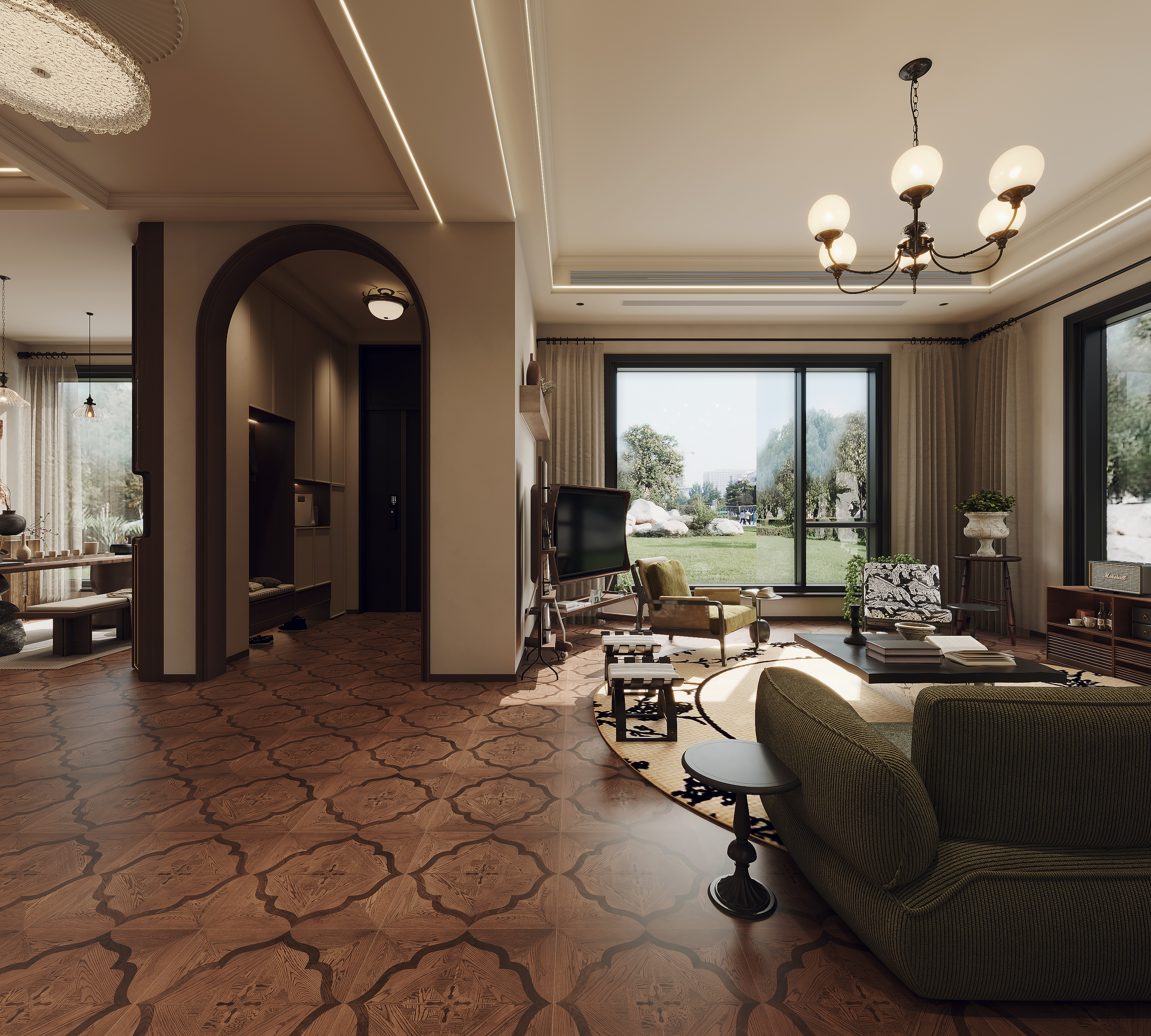 针对 80 后业主对品质生活与复古美学的双重追求,以中古风(Mid-Century Modern) 为核心设计语言,融合南洋风、侘寂风的自然质感,打造兼具复古氛围、实用功能与空间通透感的私宅,让 20 年行业经验沉淀的设计理念,落地为有温度、有故事的家。