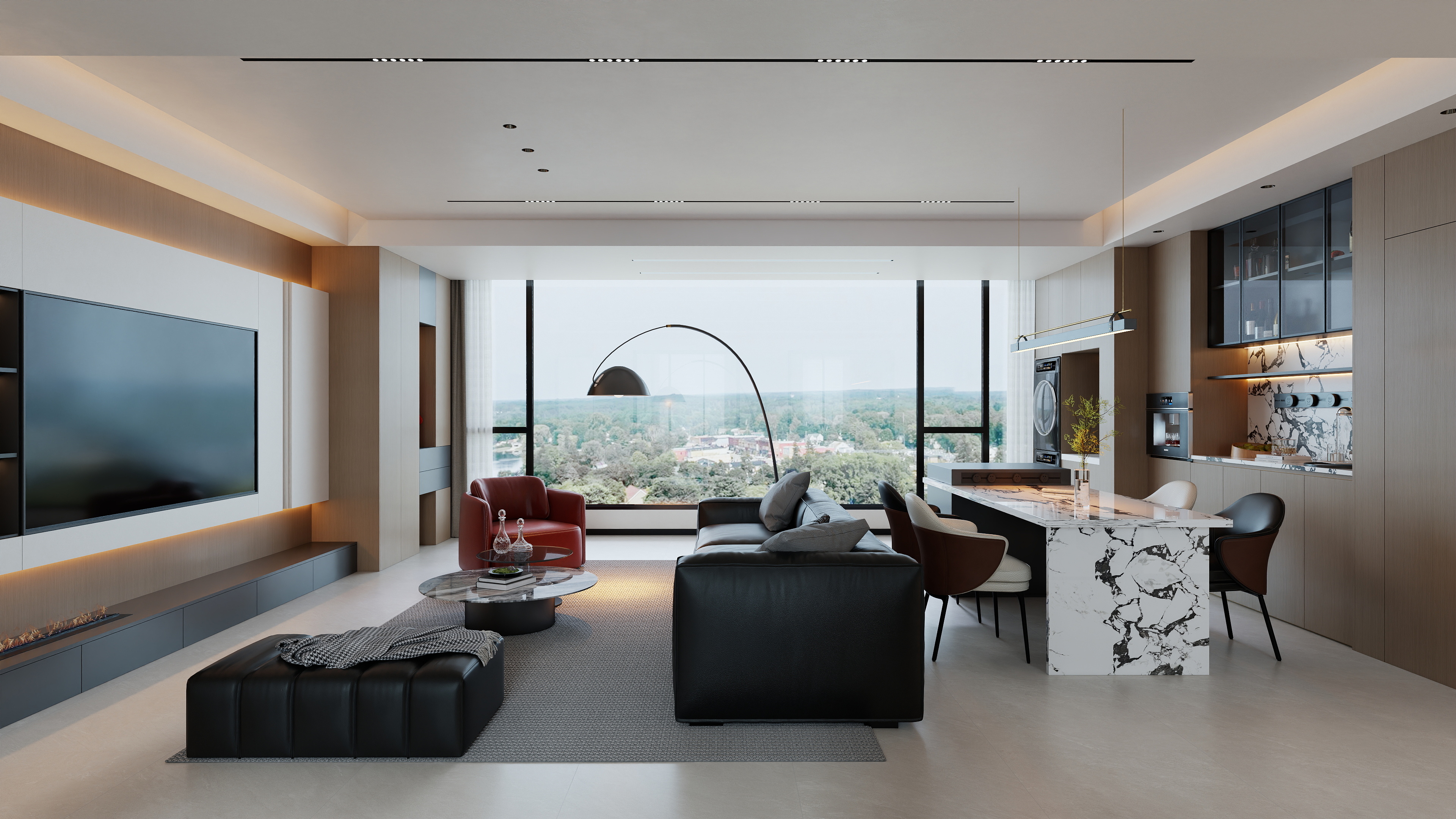 本方案以「克制的秩序感,无界的松弛感」为核心,打造适配当代都市生活的现代极简客餐厅空间。以黑白灰为基底,通过利落的线条、温润的材质与无主灯光影,诠释 “less is more” 的设计哲学,在极简秩序中,保留空间的温度与通透感,实现高级美学与实用生活的完美平衡。
